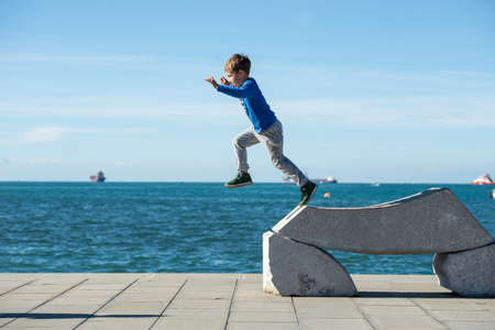 Toddler boy jumping from a stone sculpture by the sea on a sunny autumn day.