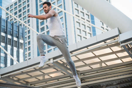 brave strong man jumping in the street. full length side view photo. strength training , leisure