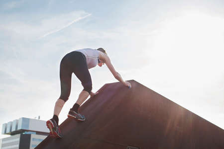 Young sporty woman doing parkour in city. The girl is engaged in freerunning.