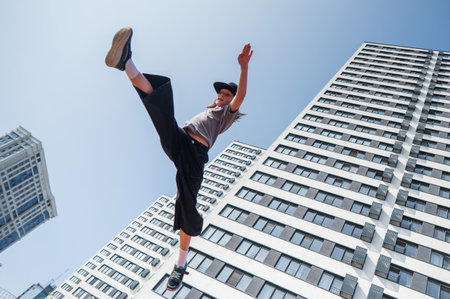 A man in athletic wear is captured mid-jump, set against a backdrop of modern architecture. The image showcases a dynamic composition with a low-angle perspective and clear lighting. The color palette features a contrast of dark clothing against a bright sky. Suitable for illustrations and editorial content.