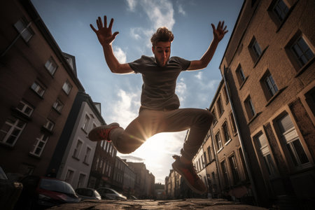 Man engaged in parkour jumping on the street