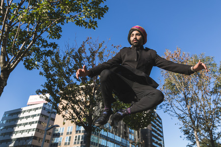 Active Latino young man jumping in action. Extreme sport activity, parkour outdoor free running or healthy lifestyle concept