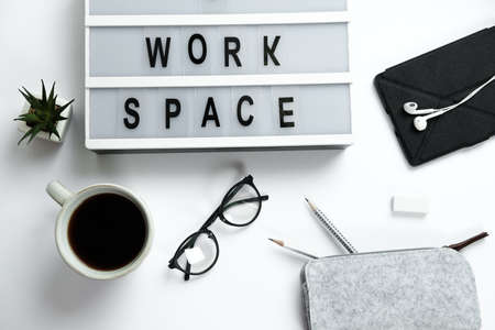 Stylish hipster white desktop top view, laptop, coffee, glasses, headphones, pencils, workspace