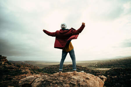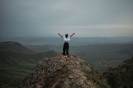 Happy woman tourist hiking up mountain enjoying nature. Landscape in cloudy gloomy windy weather. Female in white shirt with open arms outstretched in joy, enjoying travel. Freedom concept