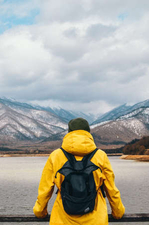 Back view of a man in a yellow raincoat with a backpack stands on the embankment and looks at the snowy mountains.
