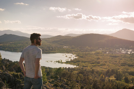 Young man watching the sunset on the lake from the top of the hill