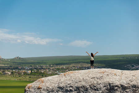 beautiful woman standing on a cliff looking at the nature of the journey