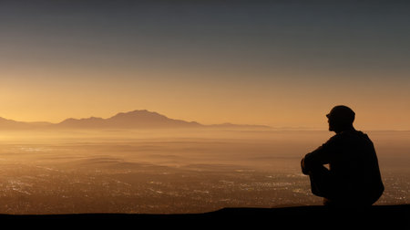 A person is silhouetted against a vast landscape bathed in warm, golden light. The scene showcases mountains and a hazy atmosphere suggesting either dawn or dusk. The overall composition emphasizes solitude and reflection, suitable for various editorial and commercial applications.