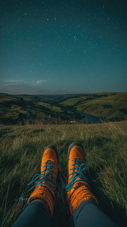A pair of orange hiking boots rests on a grassy hillside, looking toward a valley beneath a dark, starry sky. The composition features a low-angle perspective, with green and blue hues dominating the scene. This outdoor image could be used for travel, adventure, or environmental themes.
