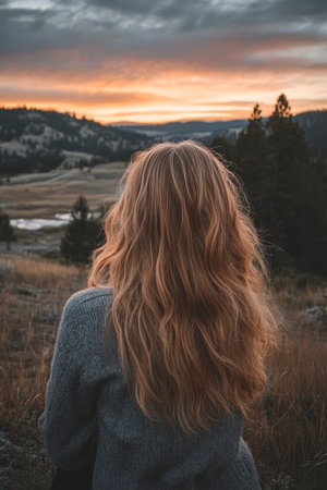 A woman with flowing hair gazes at a beautiful sunset over a vast landscape with mountains and dark cloudy sky. This serene image is perfect for travel blogs and nature-themed content.