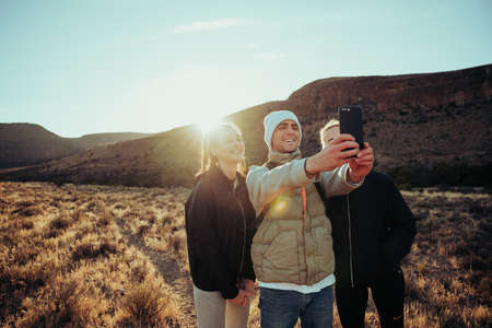 Group of happy teens hiking in beautiful forest terrain taking selfie to post on social media