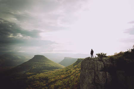 Man standing on the edge of a cliff with an atmospheric mountain landscape backdrop. Place your text here