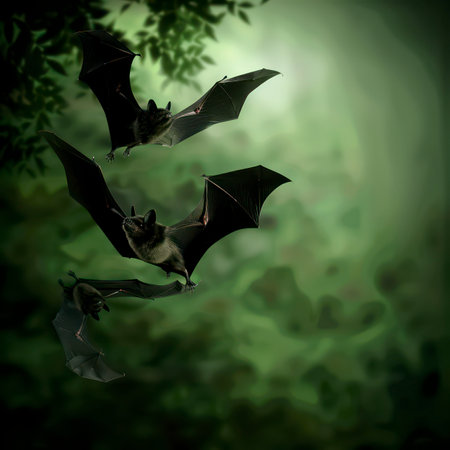 A group of bats flying in formation against a black background, showcasing their intricate wing structure and nocturnal nature.