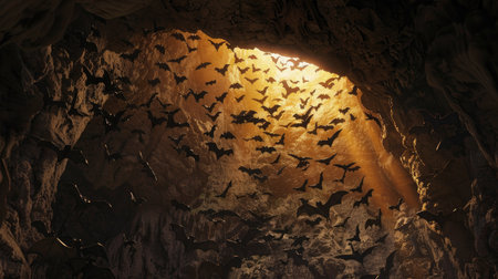 Bat with outstretched wings flying from a dark cave entrance. bright sunrise illuminates the horizon, creating a dramatic silhouette against the sky.