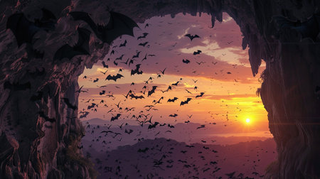 Majestic flight of bats from a cave at dusk, sky painted in shades of orange and pink