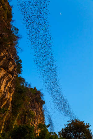 A lot of bats flying out of the cave to forage at Noen Maprang district, Phitsanulok, Thailand