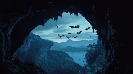 An enchanting scene showcasing a cave entrance where bats fly against a dramatic dusk sky. The surrounding mountains and serene atmosphere create an intriguing wilderness landscape.