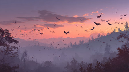 A cacophony of wild animal spirits erupts in the sky as a flock of majestic bats take flight in the evening air