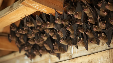 Lots of brown bats hanging upside down under the wooden roof of a barn.