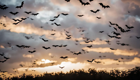 A flock of bats fly in silhouette against a sunset sky, creating a dramatic and mysterious scene.