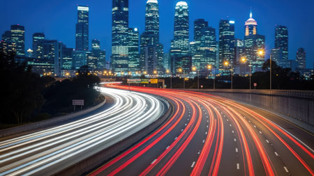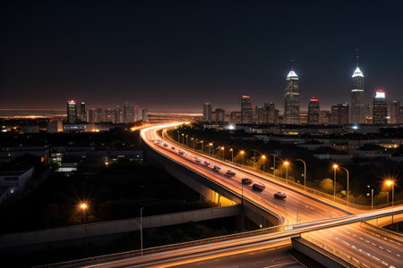 Captivating nighttime view of a busy highway illuminated by vibrant light trails, showcasing modern skyscrapers and the dynamic energy of urban life.