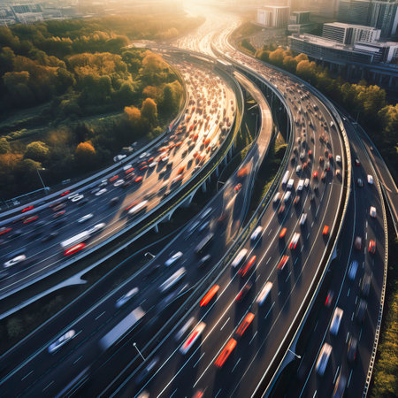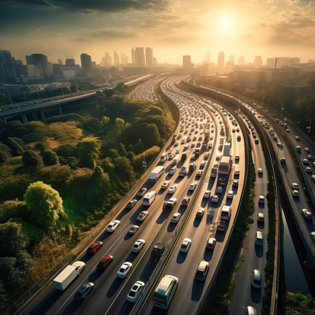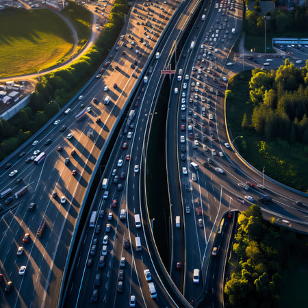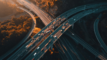 Generative AI High-altitude shots displaying a highway interchange during rush hour, highlighting the movement of vehicles.