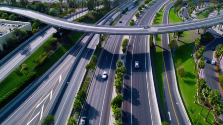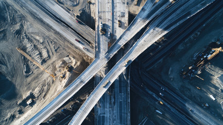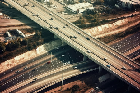 A top-view perspective of an elevated highway interchange, showing its modern design and infrastructure. Generative AI