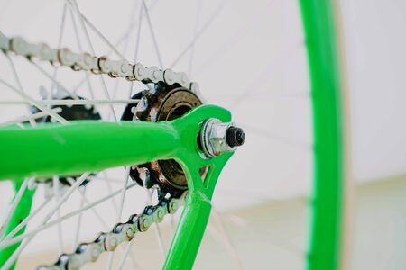 Wheel with a tread with a chain closeup. Bike, cardio workout