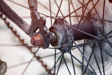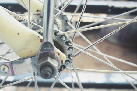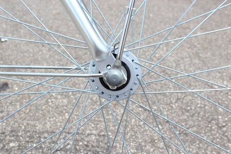 Asterisks and spokes of a bicycle. Steel structural element of the bicycle mechanism, fastening and cleaning