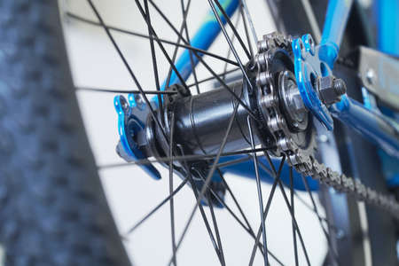 Close-up of wheel with chain and sprocket disc brake and posterior derailleur of modern mountain push-bike. Bicycle detailed view. Push-bicycle workshop concept