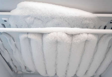 Close-up of opened deep freezer with ice and snow. Freezer before defrost. Empty shelves of fridge.