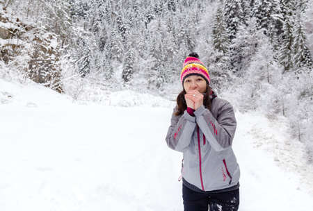 Young woman with colored clothing blows in frozen hands in winter day. Place for text