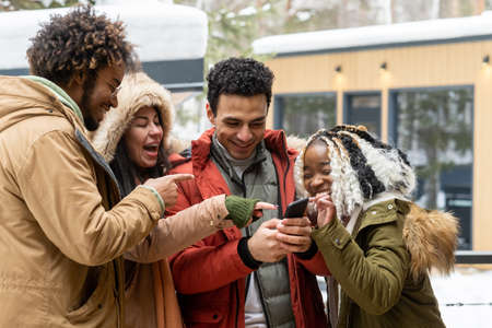 Group of happy friends watching funny video on smart phone and laughing together standing outdoors