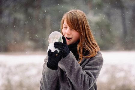 Surprised caucasian blonde girl examines a magic glass snow globe. Winter season scene. Falling small snowflakes. Snowfall