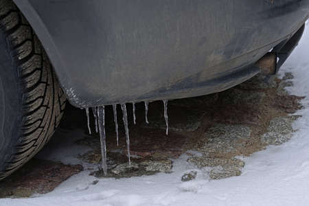 Beautiful icicles on the car. Concept for winter and dangerous winter traffic of cars on the road.