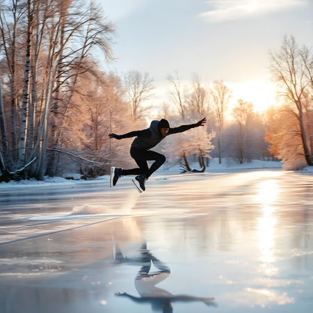 Skates carve through fresh ice, spraying droplets in the cold air as the sun sets behind trees, creating a serene winter atmosphere filled with movement and excitement.