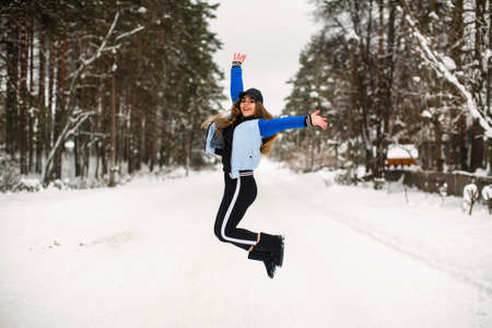 Caucasian woman in a blue sweater is skating on a frozen lake. Figure skater performs a swallow