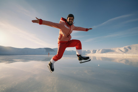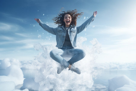 woman joyfully jumping on ice. A high quality image making by generative ai.