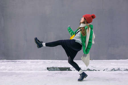 Girl hipster in bright clothes laughing and smiling, a walk in the city. Young happy woman in a red knit hat, green jacket, gray scarf, yellow bag on the background of gray wall. Women's fashion.