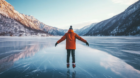 A man in a warm winter jacket enjoying ice skating on a frozen lake surrounded by mountains.