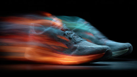 A captivating image of running shoes in motion, displaying a blur effect that conveys speed and energy. Ideal for sports and fitness themes.