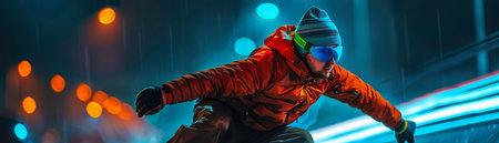 Young girl, athlete glides confidently across the ice, surrounded by bright, futuristic lights, focused on achieving victory