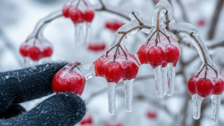 This image features a close-up of frosted red berries on a branch, isolated on a white background. The berries are covered in a layer of ice, giving them a sparkling appearance. The image is on a transparent background, making it suitable for various design applications. The scene evokes a sense of winter and nature's beauty.