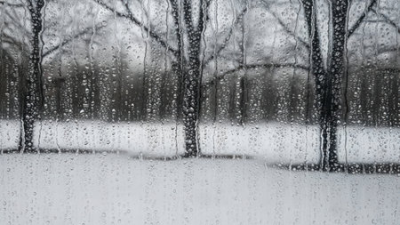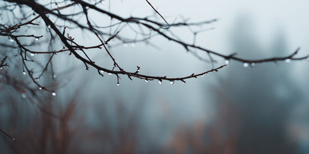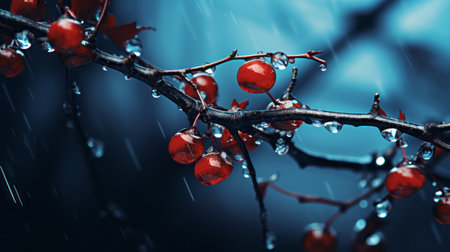water drops glisten on branches on a gray rainy day, creating a serene atmosphere. the photo, rendered in unreal engine, showcases a unique blend of dark sky-blue and crimson hues. with its still life realism, cranberrycore aesthetic, and japanese-inspired imagery, the image exudes a sense of naive charm. the post-processing enhances the overall visual appeal. ai generated