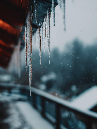 Icicles dangle from a rustic eave as snow gently falls, creating a peaceful winter atmosphere near a wooden railing in a forested location.