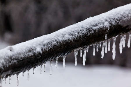 Icicle hangs from metal fencing close up, freezing winter temperature.