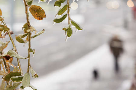 Icy freezing rain winter weather, autumn leaves covered with ice after freezing rain