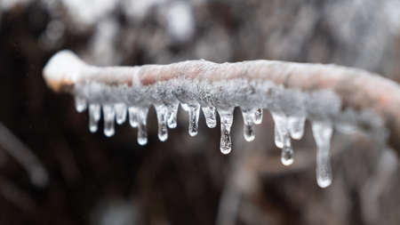 Icicles on icy tree branches. temperature swing season and winter weather in autumn