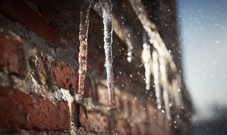 A brick wall with icicles hanging from it. The icicles are dripping water. The wall is made of red bricks