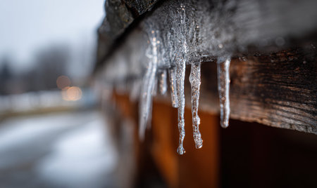 Icicles hanging from a wooden beam. The icicles are frozen and appear to be dripping water